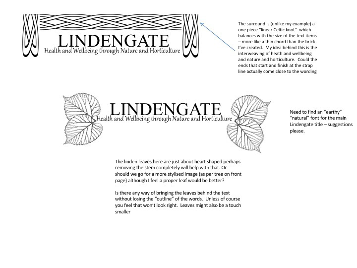 The client wanted the 'Linden' tree to feature in the logo as it represents therapeutic healing. Their strapline was "Health and Wellbeing through Nature and Horticulture" which they also wanted featured in the logo. As this was quite wordy, they envisaged an arch of some kind using the strapline to represent the people walking into their garden.